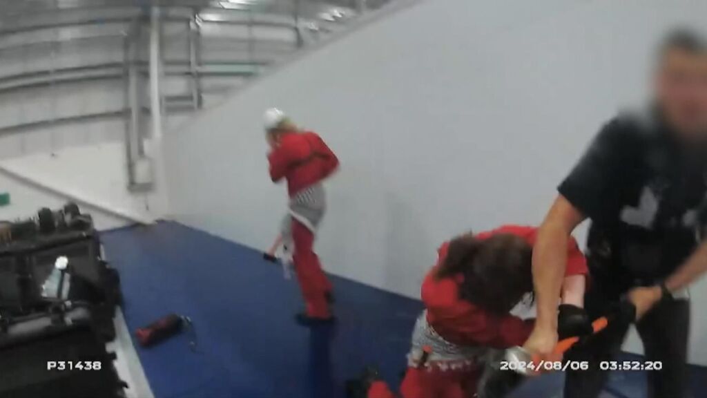 In body-worn camera footage played in court, prosecutors said security guards were sworn at, had sledgehammers swung at them, were whipped, and one was sprayed with a foam fire extinguisher.